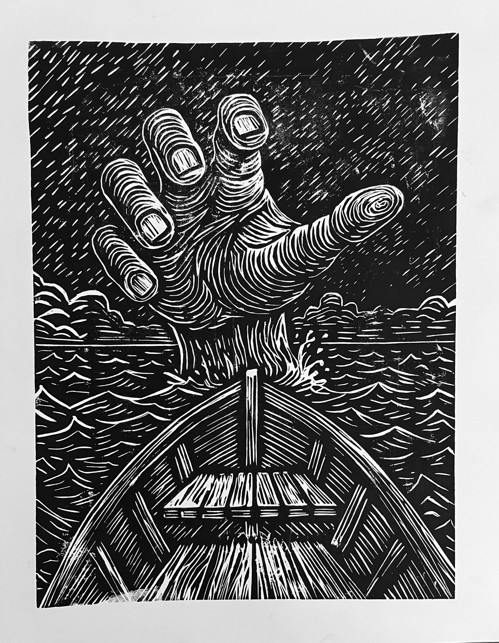 An 11×14 linocut print of a hand coming out of the ocean in front of a boat titled “All Hands”.
